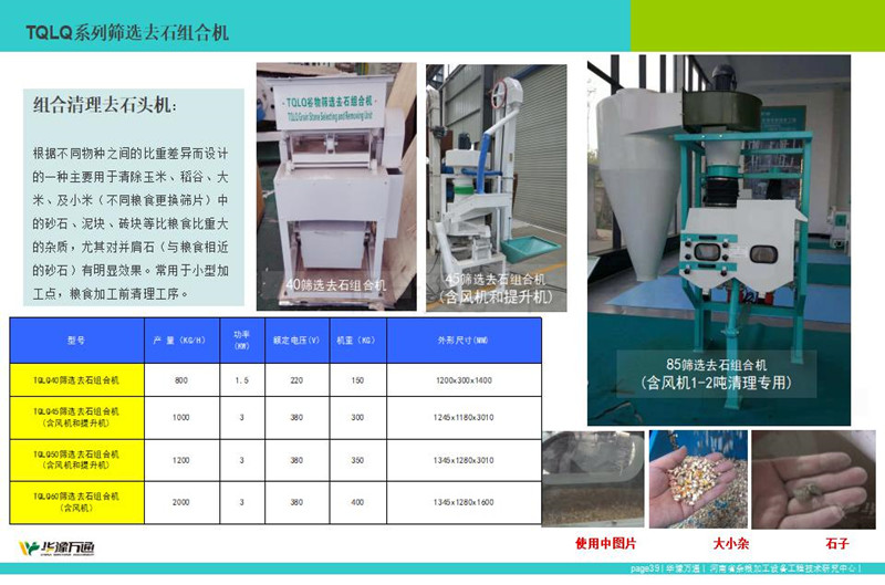 華豫萬通生產(chǎn)的TQLS系列組合清理去石機(jī),該系列組合型清理去石機(jī)整合風(fēng)機(jī)、振動(dòng)篩、去石機(jī)為一體的糧食清理設(shè)備,常應(yīng)用于糧食加工中清理去除大中小雜、石頭以及輕雜。其中TQLS-45型清理去石機(jī)常應(yīng)用1噸下糧食清理,而TQLS-85組合清理去石機(jī),精工制作常應(yīng)用于30噸左右糧食加工生產(chǎn)線的前段清理工序。