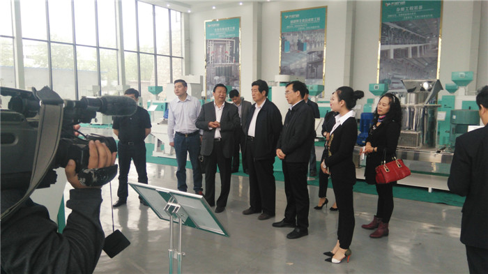 商會參觀公司設(shè)備展廳,董事長沈玉現(xiàn)介紹很新智能谷物除霉設(shè)備